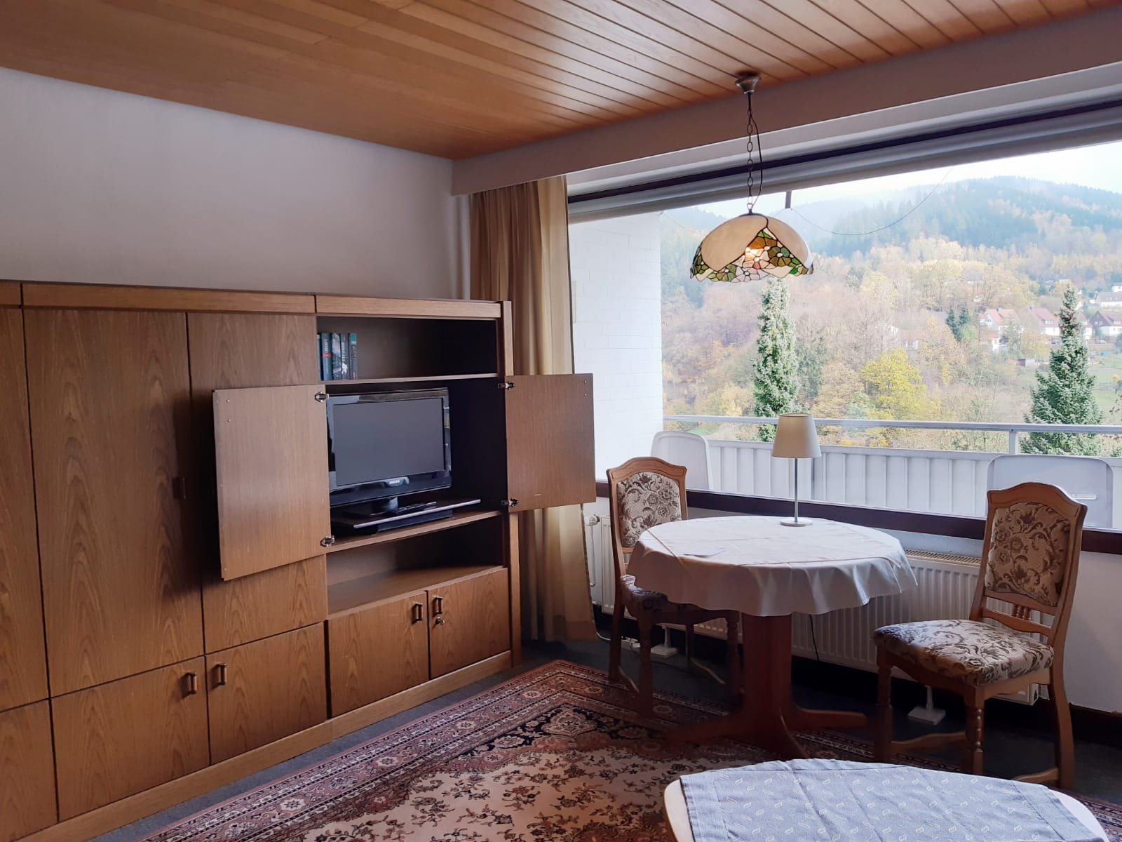 kombinierter Wohn-Schlafbereich, kleine Küchenzeile, DU/WC, Fernseher und überdachter Balkon.
